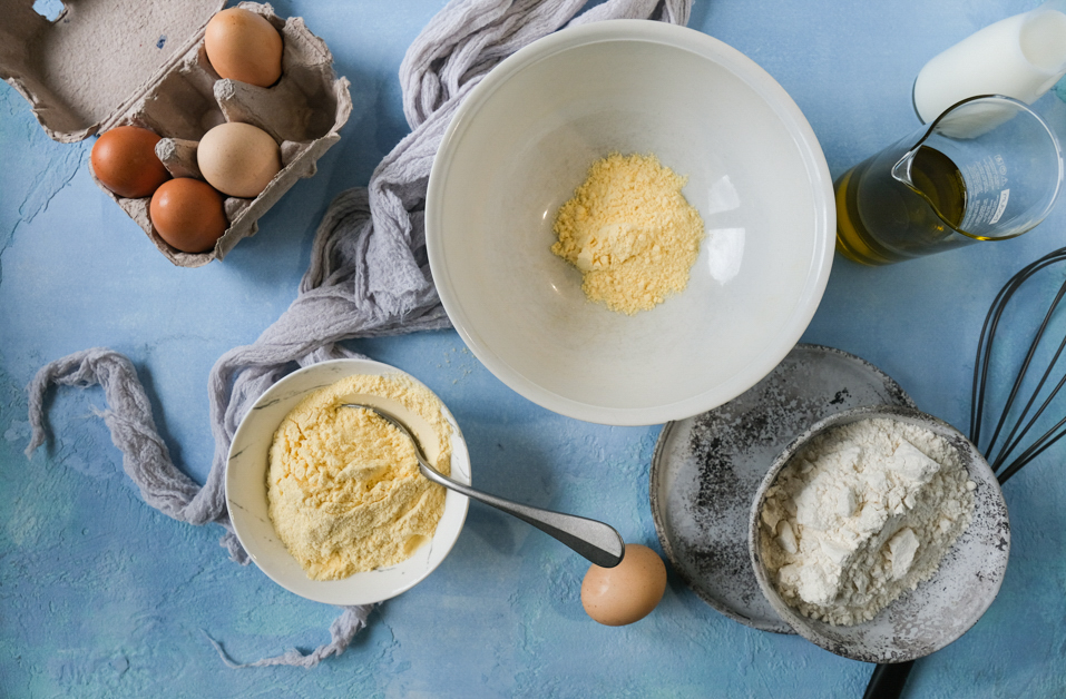 1. Προθερμαίνουμε τον φούρνο στους 185C. Σε ένα μπολ βάζουμε τα αλεύρια, το bp και το αλάτι. Ανακατεύουμε καλά με το σύρμα. Προσθέτουμε γάλα, το ελαιόλαδο και τα αυγά και πάλι ανακατεύουμε καλά με το σύρμα. Το μείγμα είναι εύπλαστο και λείο. Τέλος, προσθέτουμε την τριμμένη φέτα ή και κάποιο άλλο τυρί που ενδεχομένως προτιμάμε. Γεμίζουμε τις θήκες μιας χρήσης (τις προτίμησα γιατί είναι πιο εύκολο να τις πάρει το παιδί μαζί του και στο σχολείο) ή τις θήκες σιλικόνης κατά τα 2/3. Ψήνουμε στον φούρνο για 30 λεπτά περίπου μέχρι να ροδίσουν.