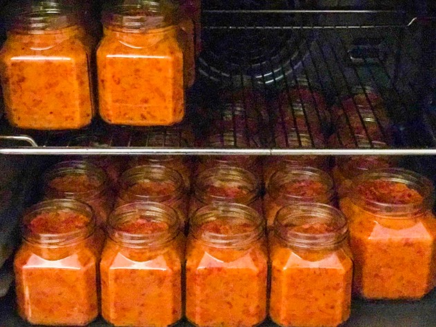 3. Earlier we have washed and placed the jars into the oven at 100 degrees for 30 minutes. Once they are ready, fill the jars with the warm sauce and leave them open, in the oven, until they completely cool off and catch a thin crust. Then you can close and store the jars.