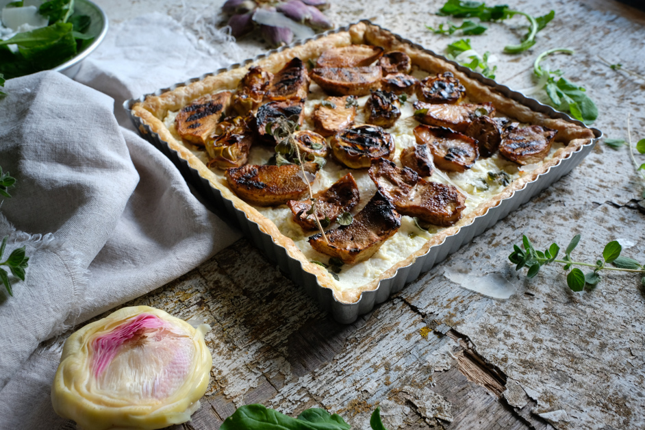 5. Serve the tart with the greens on top.